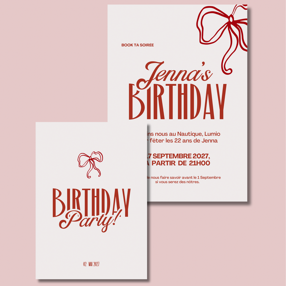 Avec ses tons rouges élégants et son grand ruban en illustration, cette invitation mise sur le glamour et la modernité. Le design typographique affirmé apporte une touche de caractère, idéale pour une fête entre girls.