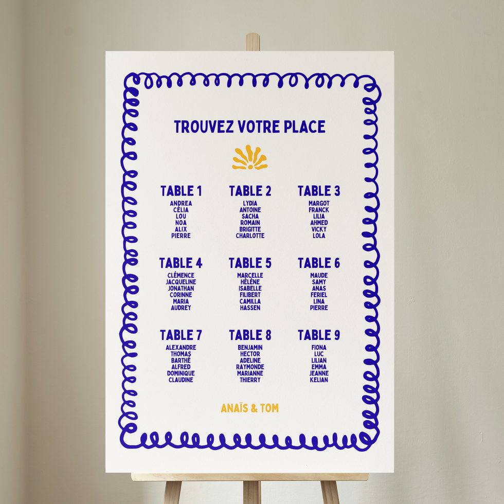 Apportez du peps et de l’élégance à votre réception avec notre plan de table « Bleu Azur & Soleil », un design moderne et solaire qui met à l’honneur les courbes et les couleurs de l’été.